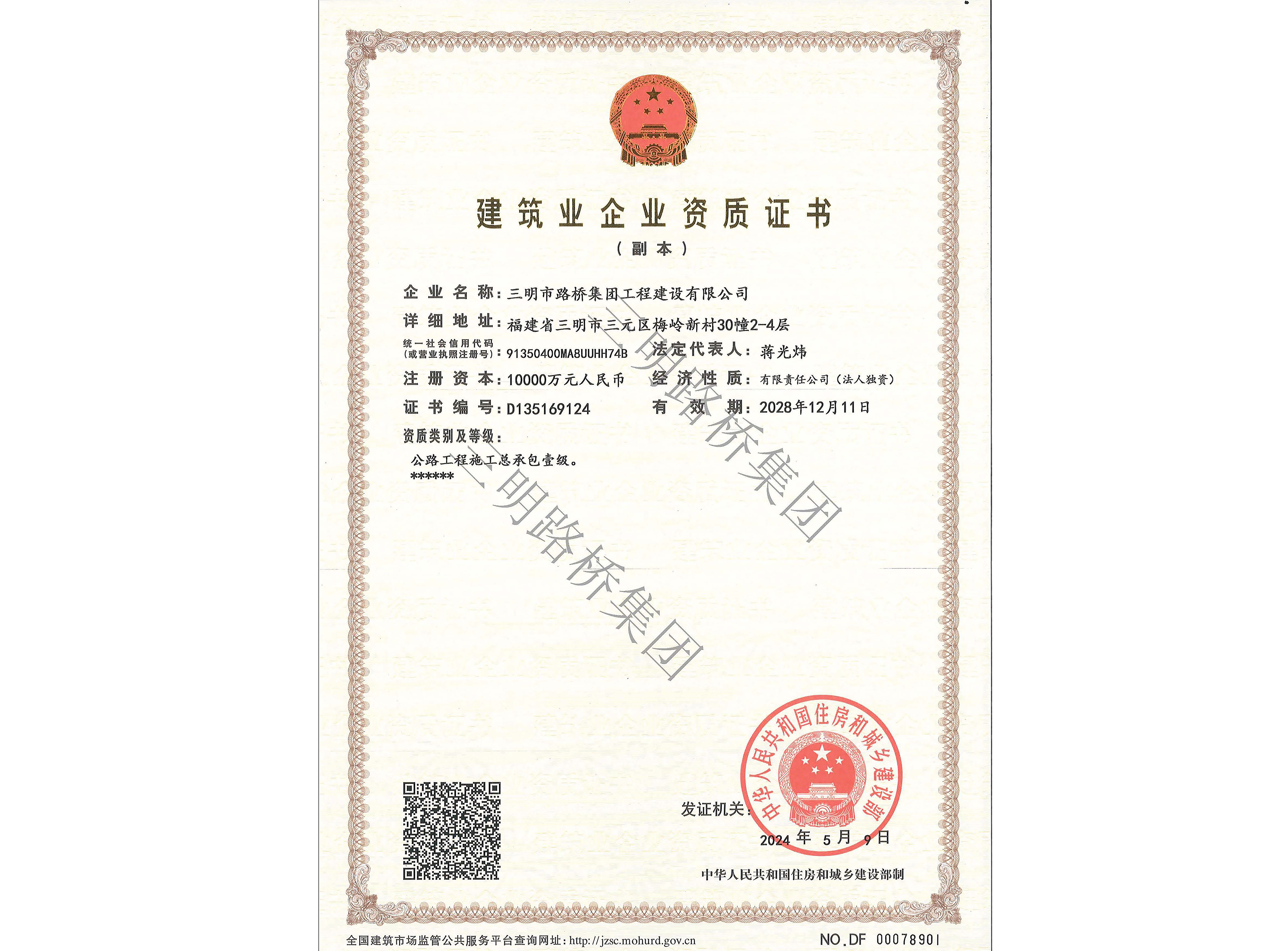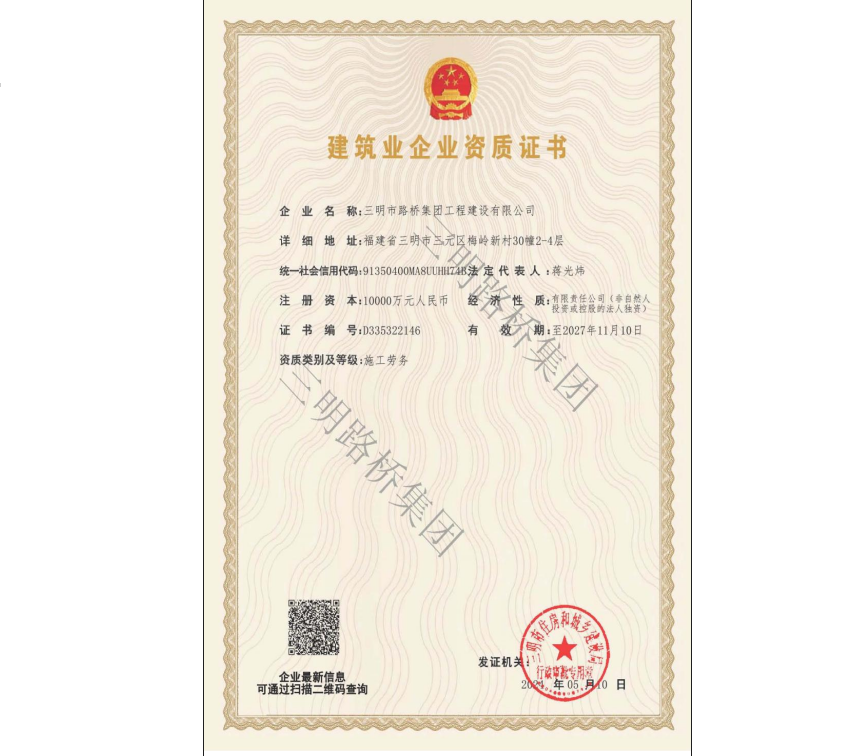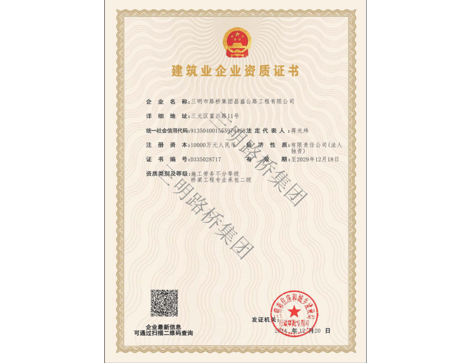 建筑工程施工總承包二級、公路路面工程專業承包二級、公路路基工程專業承包二級、