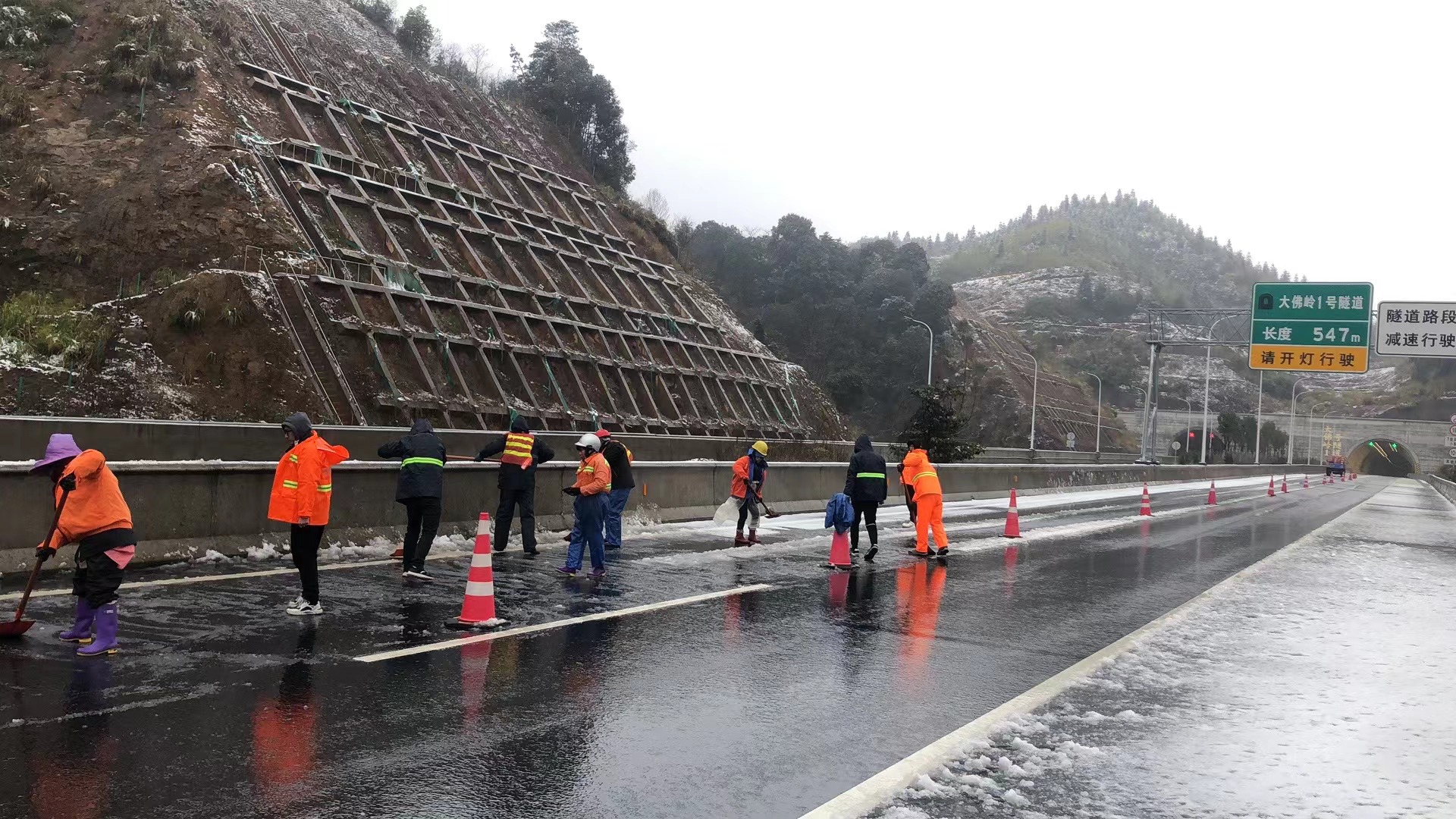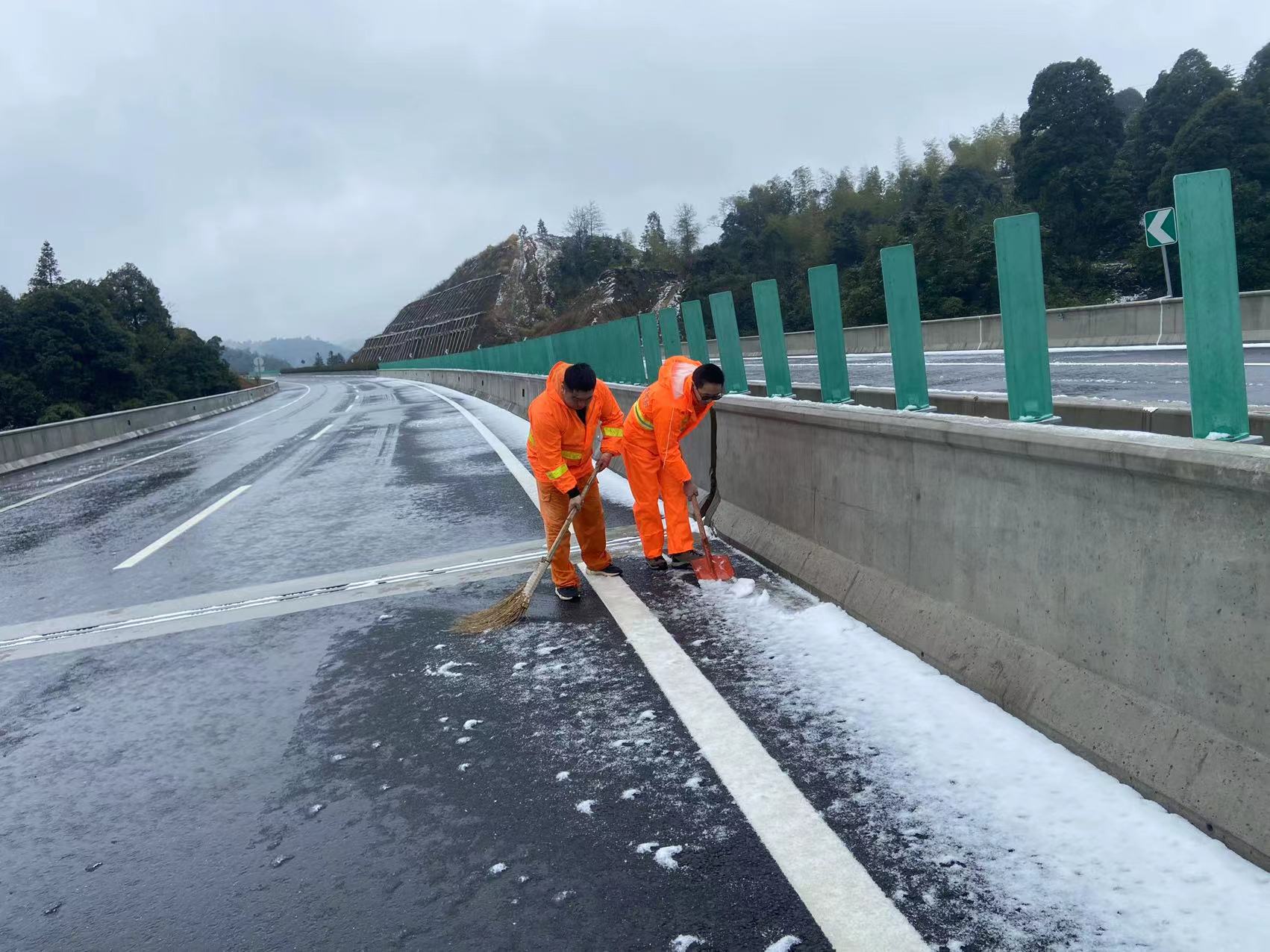 在保暢工作中,養(yǎng)護人員是抗冰除雪大軍中一面最亮眼的旗幟,他們與冰雪奮戰(zhàn),與時間賽跑,哪里有困難,他們就到哪里;盡管寒風刺骨,汗水卻早已濕透了他們的衣衫,盡管腳穿雨靴,冰冷的雪水依然“侵蝕”著雙腳,但那一抹耀眼的橘色,儼然已成為高速路上最美的風景。