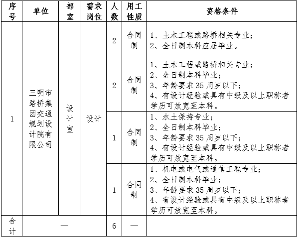 (二)報名。采取網絡報名方式,請應聘者下載填寫《三明市路橋集團有限公司公開招聘工作人員報名登記表》(附件),投遞至郵箱smslqjt@163.com(文件命名為“姓名+應聘崗位”)。報名截止時間為2022年4月8日。