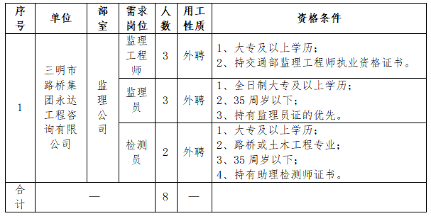 (一)公告。招聘崗位、人數、任職資格等信息在 “三明市路橋集團”官網(m.weifangyoubang.com)、眾聯人才招聘網(www.zlrczp.com)、“三明海峽人才網”、“一覽英才網”官網向社會統一公告。