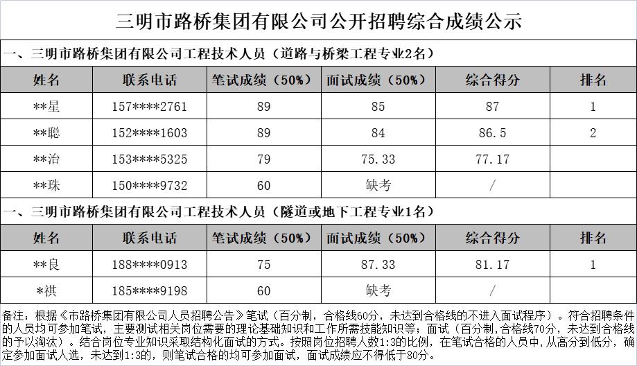 根據《市路橋集團有限公司人員招聘公告》,現將市路橋集團有限公司公開招聘工作人員綜合成績及排名情況公示如下: