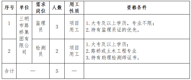 (一)公告。招聘崗位、人數、任職資格等信息在 “三明市路橋集團”官網(m.weifangyoubang.com)向社會統一公告。