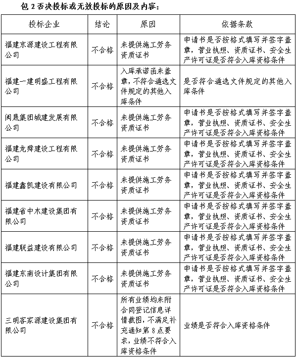 評標委員會對通過資格審查的各合格投標人,按合同包根據遴選文件規定進行評分。各投標人經評標委員會綜合分析、比較,在全部滿足遴選文件實質性要求前提下,按得分從高到低的順序進行排名,排名最高的前8名投標人將被推薦為相應合同包的入庫候選人;具體為:包2為房建工程類,排名前8名的三明市域企業入庫;若企業得分相同,則以企業信用分得分高的排名優先。再相同的,依次以業績得分、資質得分、繳交稅收金額高的排名優先。