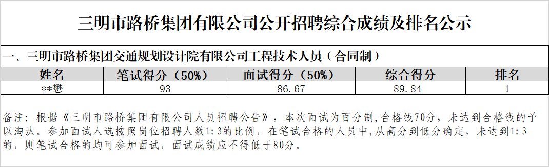 根據在三明市人力資源和社會保障局、三明市人民政府國有資產監督管理委員會、三明市殘疾人聯合會聯合辦法的2025年三明市“職通未來?才聚三明”專場招聘會上發布招聘公告,現將市路橋集團有限公司公開招聘工作人員綜合成績及排名情況公示如下: