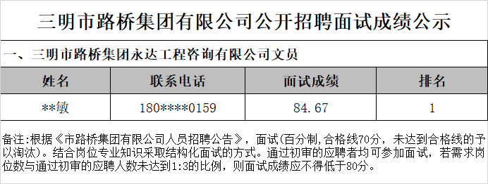 三明市路橋集團有限公司項目用工人員招聘面試環節已于2025年7月23日完成,現將面試成績予以公示: