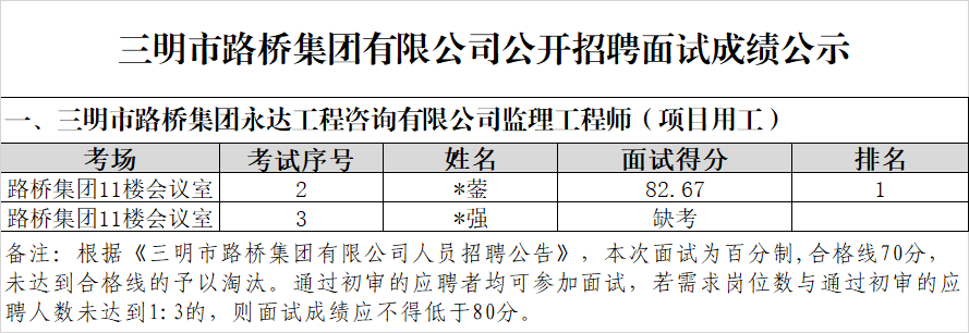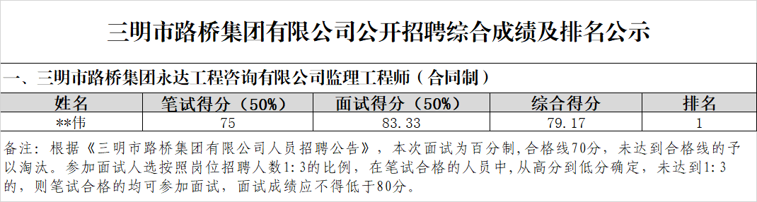 根據(jù)《三明市路橋集團有限公司人員招聘公告》,現(xiàn)將市路橋集團有限公司公開招聘工作人員綜合成績及排名情況公示如下: